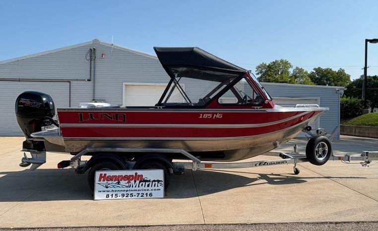 Mercury 150 Pro XS 4 Stroke. This is the all new 2026 Lund Boats 185 HG powered by a Mercury 150 Pro XS 4 Stroke in Firecracker Red with Black/Chrome Lund Letters. The boat features wood-free construction with heavy gauge aluminum hull, premium fishing seats, multiple storage compartments, livewell, and comes with an EZ Loader tandem axle bunk trailer. Equipped with soft top canvas, onboard...mor