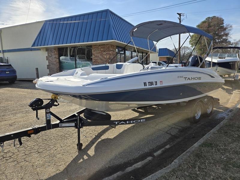 2024 Tahoe 2150 bowrider boat with Mercury F200 outboard engine and trailer, featuring only 15 hours of use. This 21-foot boat includes comprehensive equipment like bimini top, stereo system, ski storage, livewell, and stainless steel accessories perfect for watersports and fishing.