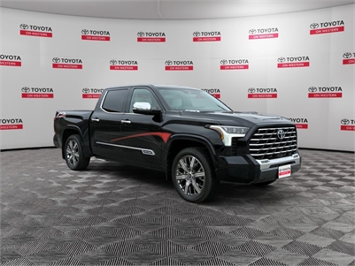 3.4L V-6, 10-Speed Automatic. Pre-owned 2023 Toyota Tundra Hybrid Capstone in Midnight Black Metallic with black and white interior. Features a 3.4L V-6 hybrid engine with 10-speed automatic transmission and 4WD capability....more