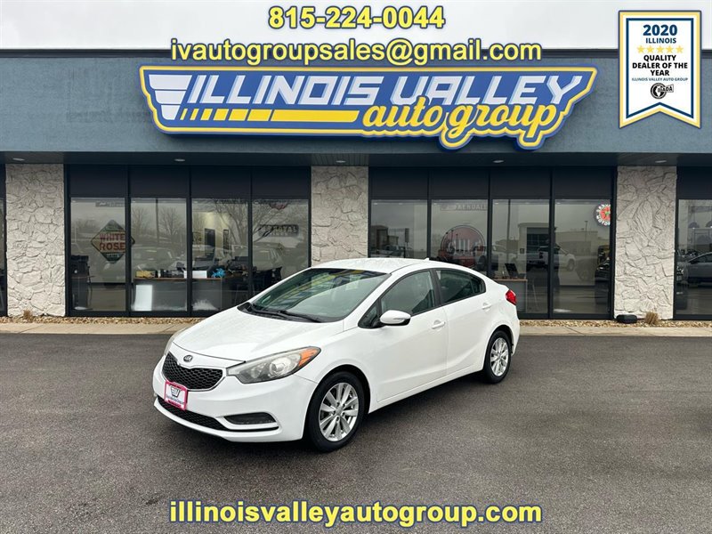 This 2014 Kia Forte LX is powered by a 1.8L 4-cylinder engine paired with a 6-speed automatic transmission. Features include Bluetooth connectivity, AM/FM/CD/MP3 audio with SiriusXM capability, cruise control, keyless entry, and air conditioning. Additional equipment includes alloy wheels, heated power mirrors, and standard safety features including stability control, traction control, and multiple airbags. 4/27/2026